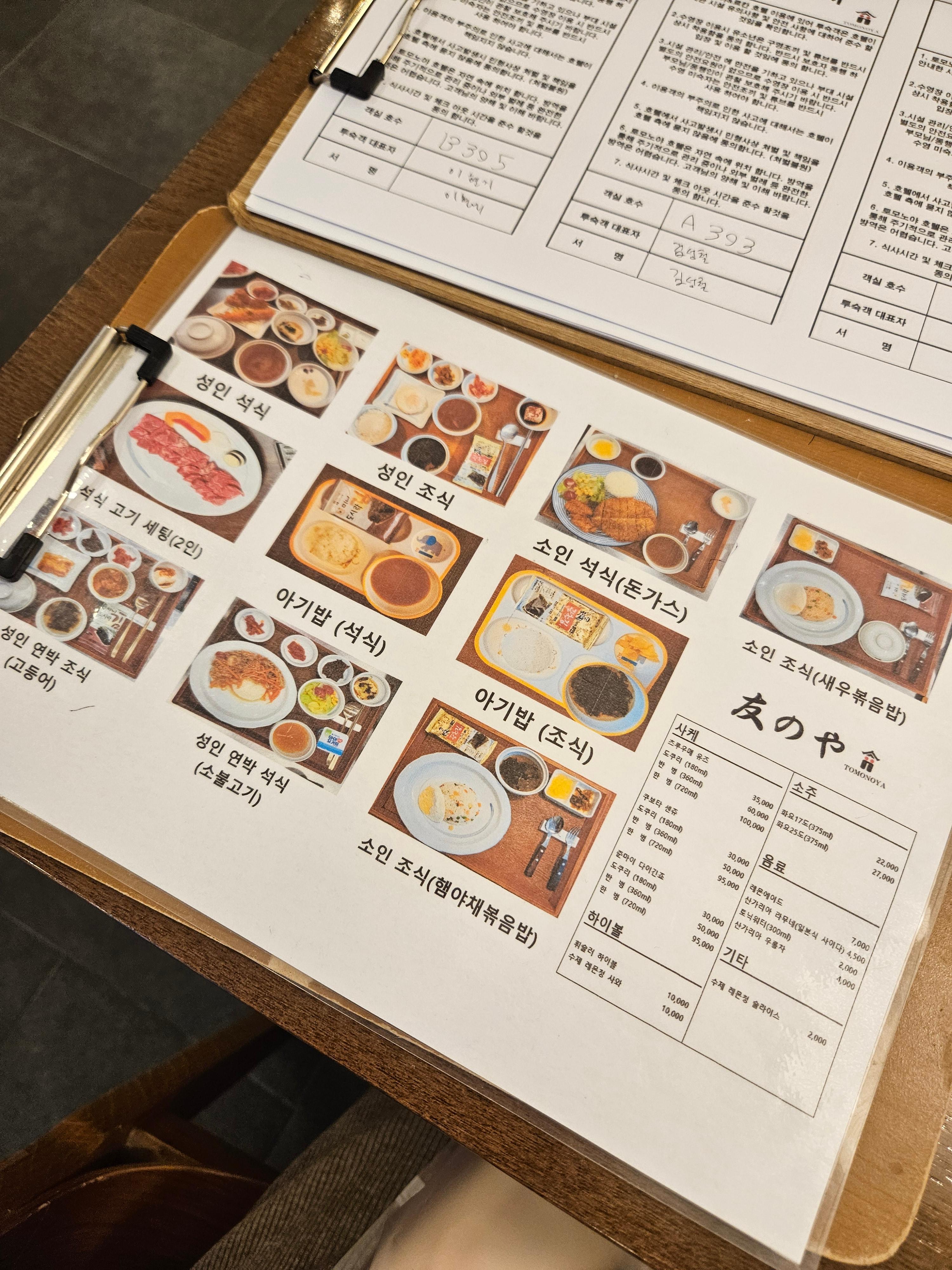 석식메뉴는 기본으로 정해져있으며 주류나 음식 추가 시 옆에 메뉴판 확인 후 별도로 추가후 결제하시면 됩니다.